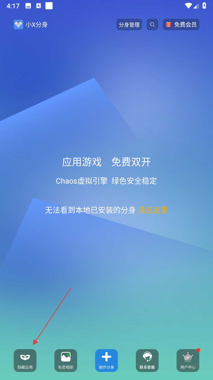 1、打開小X分身應用進入主界面,點擊底部左側的隱藏應用圖標,進入隱藏應用功能頁面。