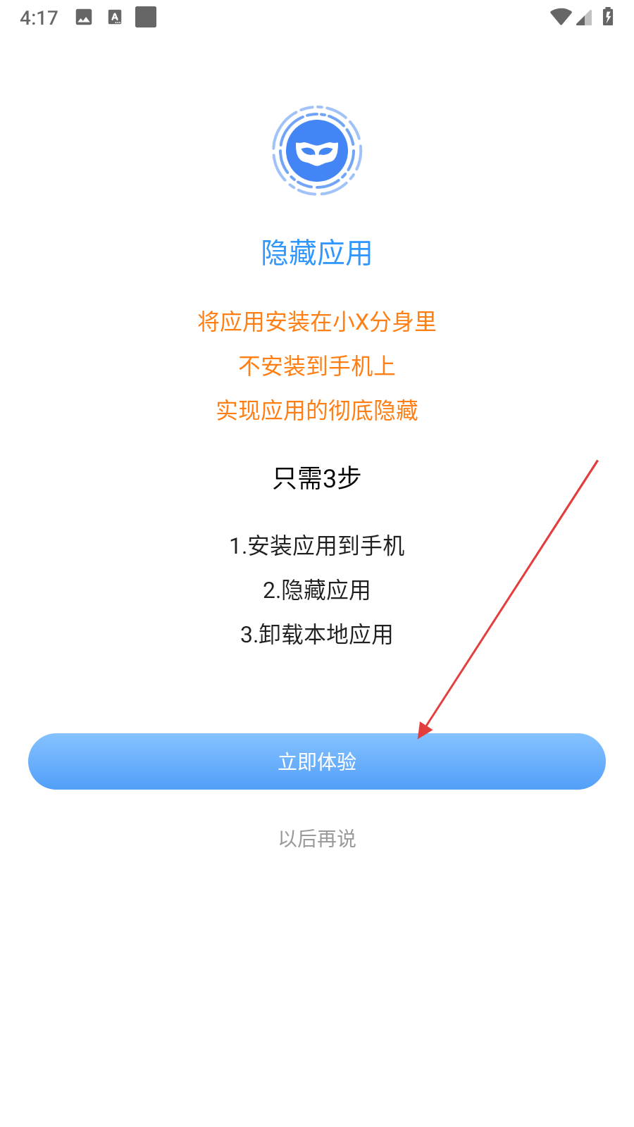 2、在隱藏應用功能頁面中,點擊立即體驗按鈕,進入選擇需要隱藏的應用界面。
