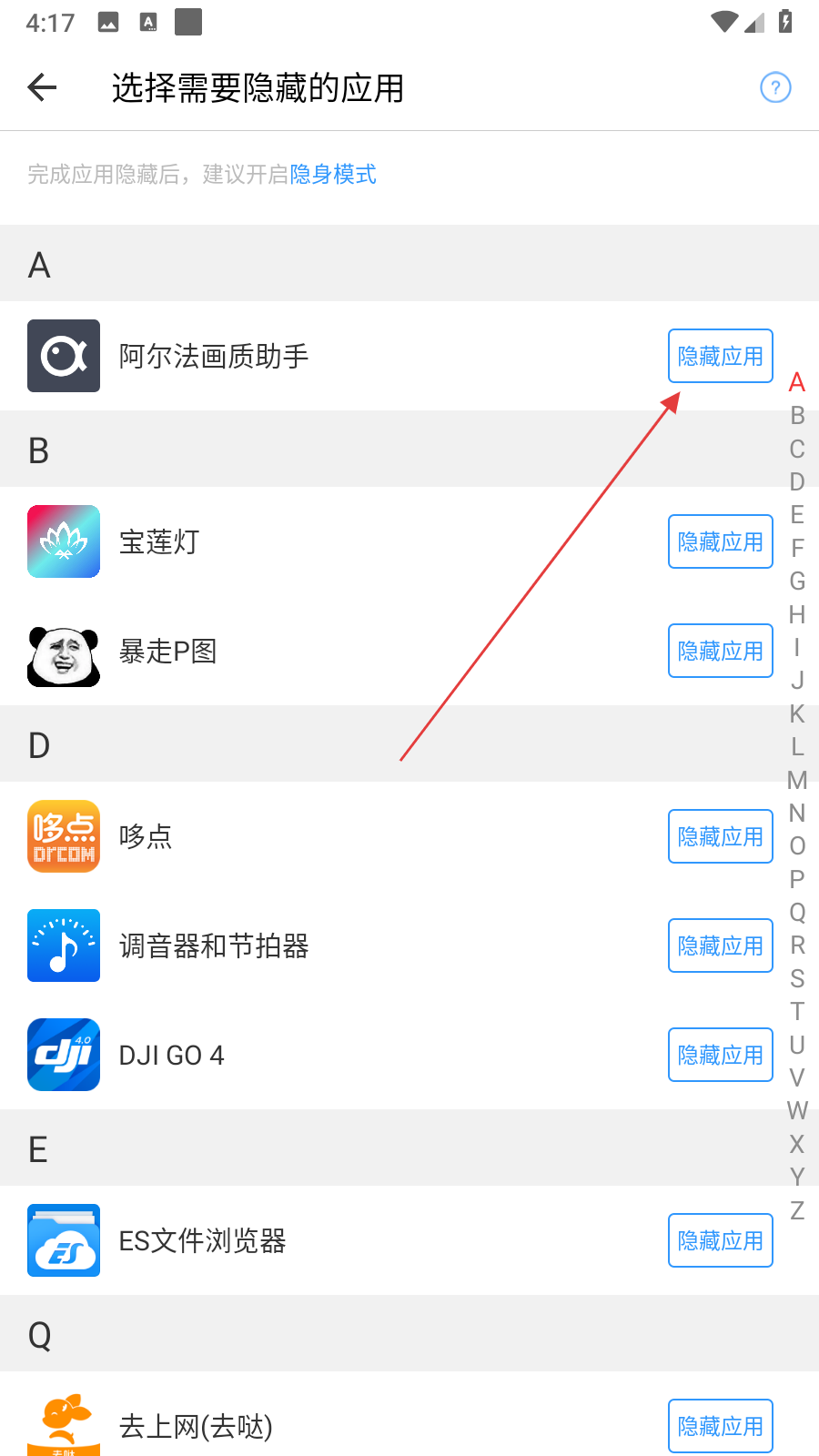 3、在選擇需要隱藏的應用界面里,瀏覽已安裝應用列表,找到想要隱藏的應用,點擊其右側對應的隱藏應用按鈕。