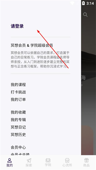 1、打開FLOW冥想APP,點擊左上角的三條橫線菜單按鈕,展開側(cè)邊欄。