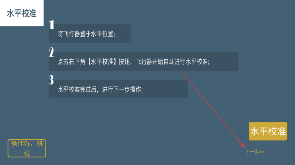 3、在水平校準(zhǔn)頁(yè)面,將飛行器置于水平位置,點(diǎn)擊右下角水平校準(zhǔn)按鈕,待飛行器自動(dòng)完成水平校準(zhǔn)后,點(diǎn)擊下一步。