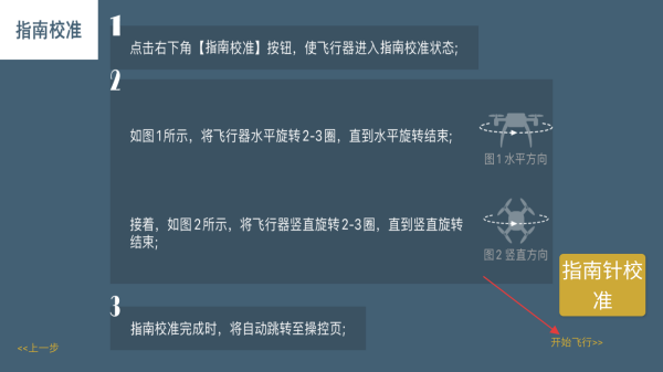 4、在指南校準(zhǔn)頁(yè)面,點(diǎn)擊右下角指南針校準(zhǔn)按鈕,按提示完成指南校準(zhǔn),點(diǎn)擊開(kāi)始飛行,即可完成4DRC PRO與無(wú)人機(jī)的連接及校準(zhǔn)。