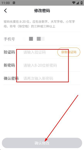 4、根據(jù)要求填寫信息,點擊確認修改,即可完成密碼修改。