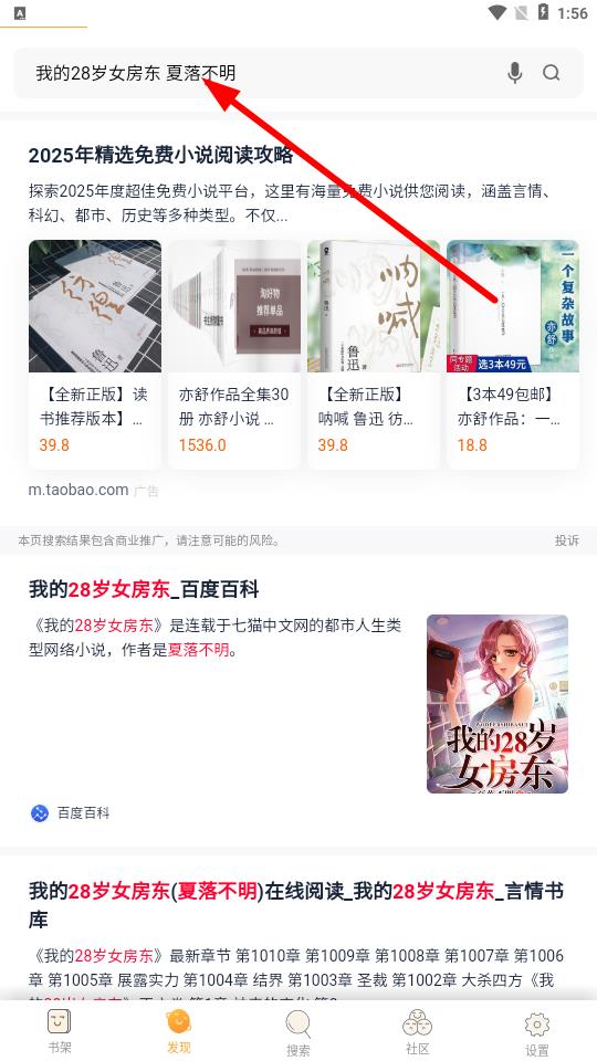 2、在“發(fā)現(xiàn)”頁面,找到頂部搜索欄,點(diǎn)擊并輸入想閱讀的小說名稱,如我的28歲女房東,然后點(diǎn)擊搜索按鈕。