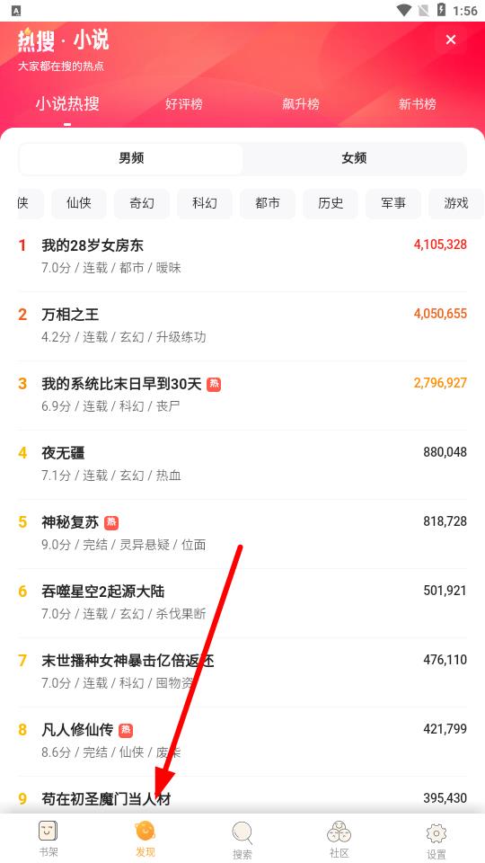 1、打開浮生閱讀APP,進(jìn)入界面后,點(diǎn)擊底部導(dǎo)航欄中的發(fā)現(xiàn)選項(xiàng),進(jìn)入小說推薦與搜索頁面。