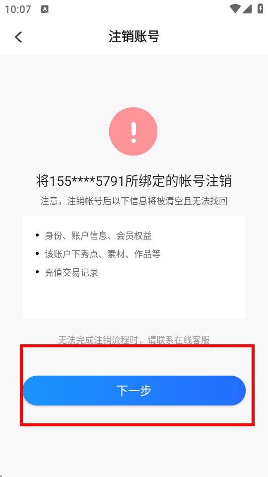 4、在注銷賬號(hào)頁面,閱讀相關(guān)提示后,點(diǎn)擊下一步,按照后續(xù)提示完成身份驗(yàn)證等操作,即可注銷賬號(hào)。