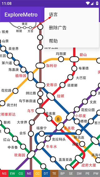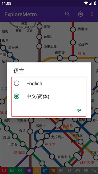 4、完成語言設置操作后,界面會切換為中文顯示,呈現(xiàn)對應語言的地鐵線路圖。