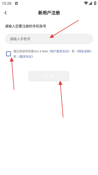 3、填寫(xiě)手機(jī)號(hào),勾選用戶服務(wù)協(xié)議和隱私條款和服務(wù)協(xié)議,點(diǎn)擊下一步。
