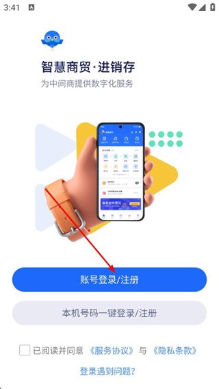 1、打開智慧商貿(mào)進(jìn)銷存,點擊賬號登錄/注冊按鈕。
