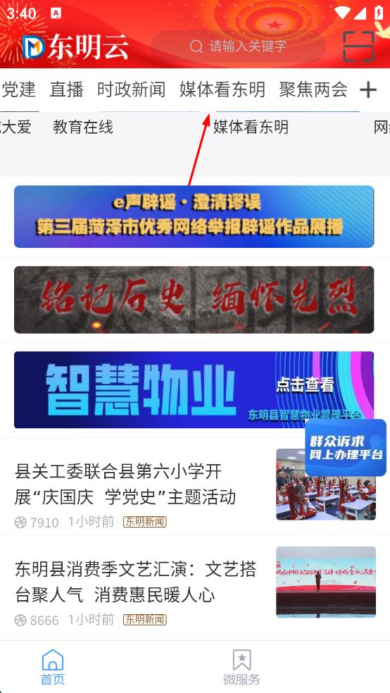 2、進入首頁,點擊媒體看東明選項,進入媒體看東明相關頁面。