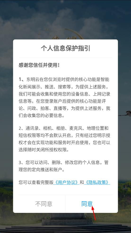 1、打開東明云App,出現(xiàn)個人信息保護指引彈窗,閱讀后點擊同意按鈕。