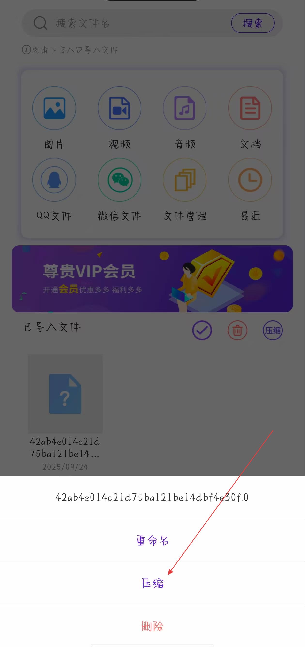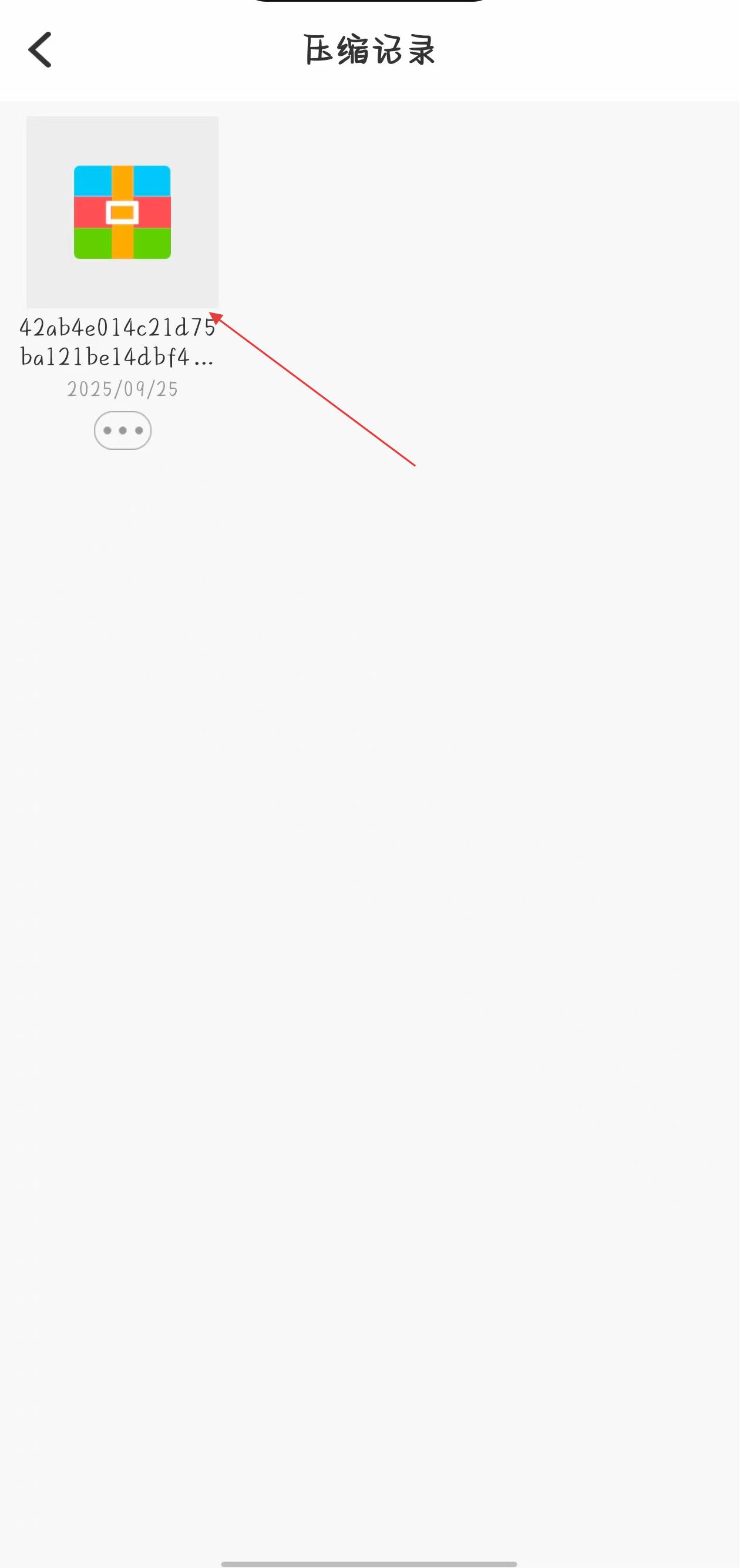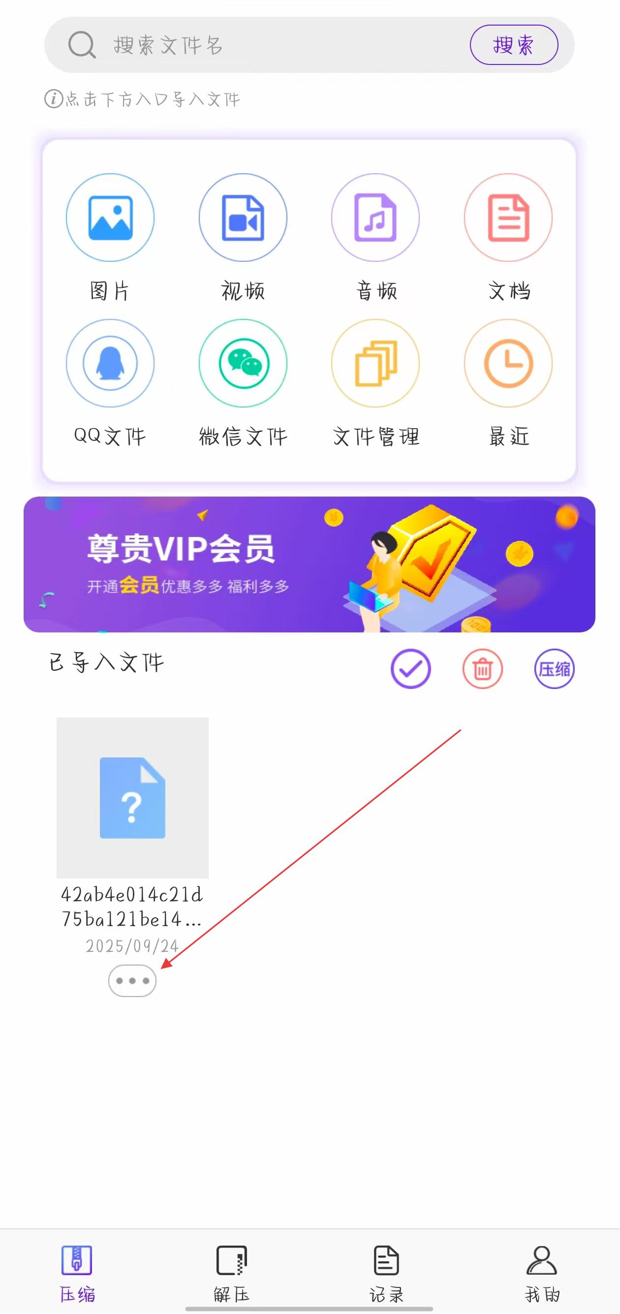 1、打開解壓縮應(yīng)用,在已導(dǎo)入文件區(qū)域找到需要壓縮的文件,點(diǎn)擊該文件下方的三個(gè)點(diǎn)圖標(biāo),彈出操作選項(xiàng)菜單。