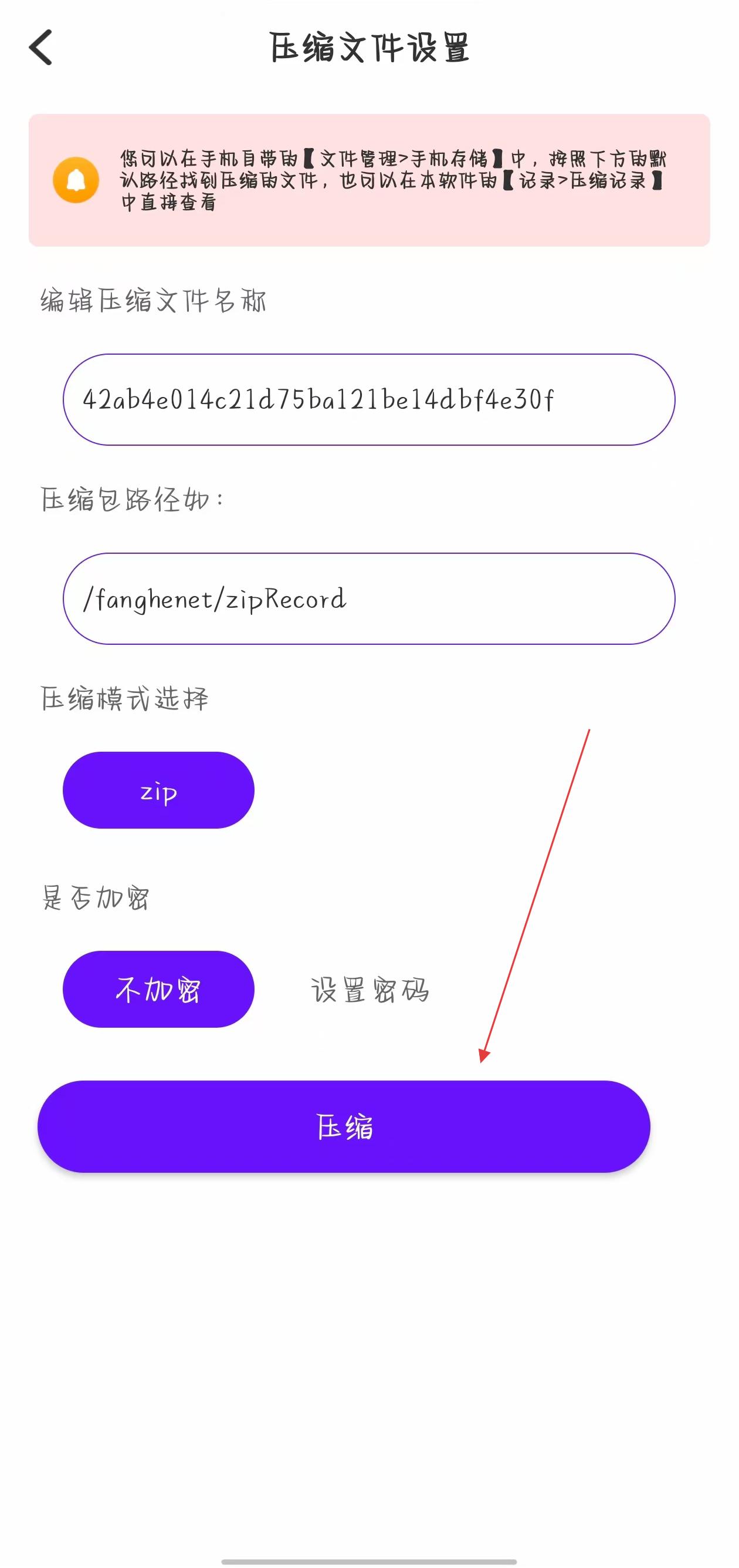 3、在壓縮文件設(shè)置頁面,可編輯壓縮文件名稱、選擇壓縮目標(biāo)路徑、選擇壓縮格式,還可設(shè)置是否加密,確認(rèn)各項(xiàng)設(shè)置后,點(diǎn)擊頁面下方的壓縮按鈕。