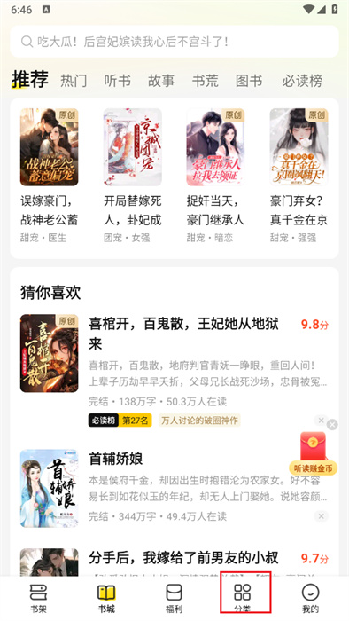 1、點(diǎn)擊屏幕下方【分類(lèi)】按鈕,以進(jìn)行小說(shuō)分類(lèi)頁(yè)面的進(jìn)入;