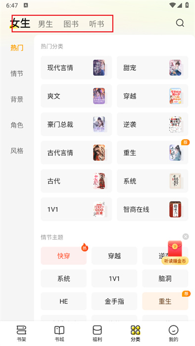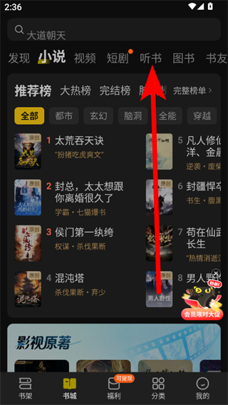1、在七貓小說(shuō)首頁(yè),點(diǎn)擊聽(tīng)書(shū)選項(xiàng),進(jìn)入聽(tīng)書(shū)頁(yè)面。