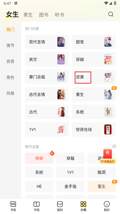 4、如用戶(hù)如果想要看逆襲類(lèi)的小說(shuō),用戶(hù)將可以點(diǎn)擊【逆襲】按鈕,以進(jìn)行逆襲類(lèi)小說(shuō)的查看;