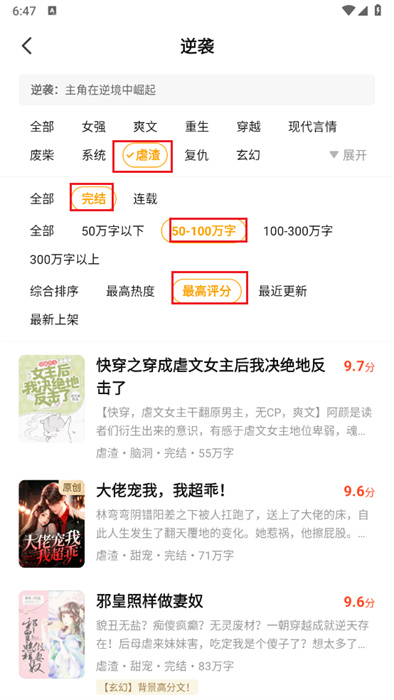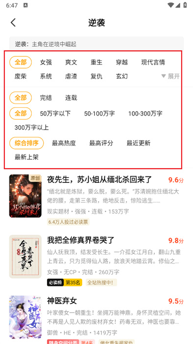 5、進(jìn)入到逆襲類(lèi)小說(shuō)的界面之中后,將可以點(diǎn)擊上方紅色框框內(nèi)的各種不同標(biāo)簽;