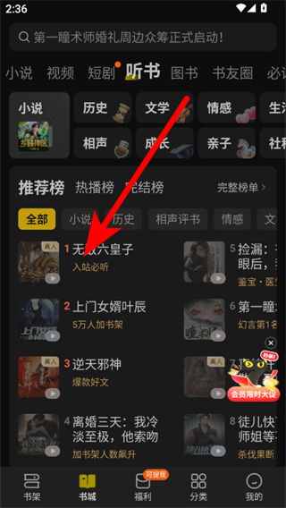 2、在聽(tīng)書(shū)頁(yè)面,點(diǎn)擊要聽(tīng)的書(shū)籍,進(jìn)入書(shū)籍聽(tīng)書(shū)界面。