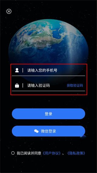 3、在登錄界面填寫(xiě)手機(jī)號(hào)碼,點(diǎn)擊獲取驗(yàn)證碼并填入收到的內(nèi)容。