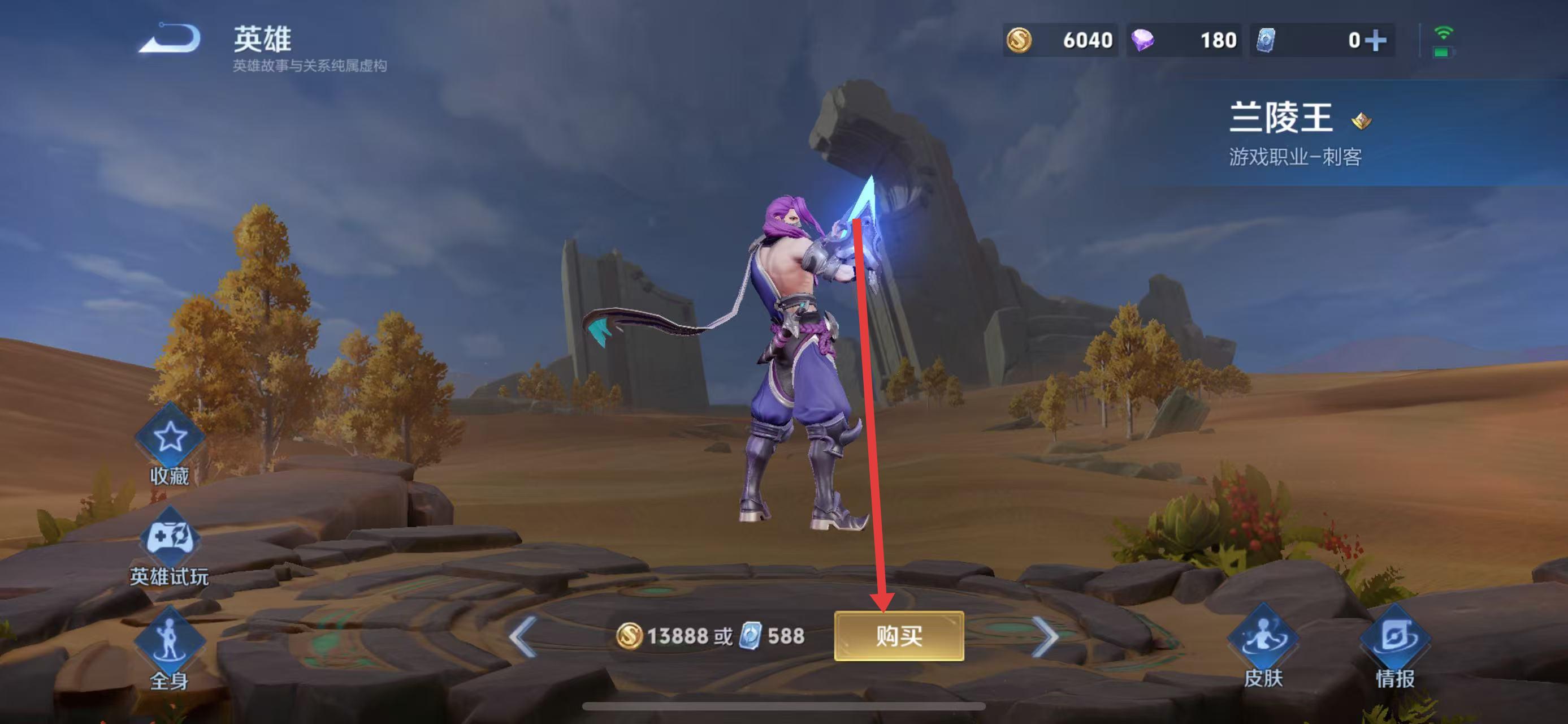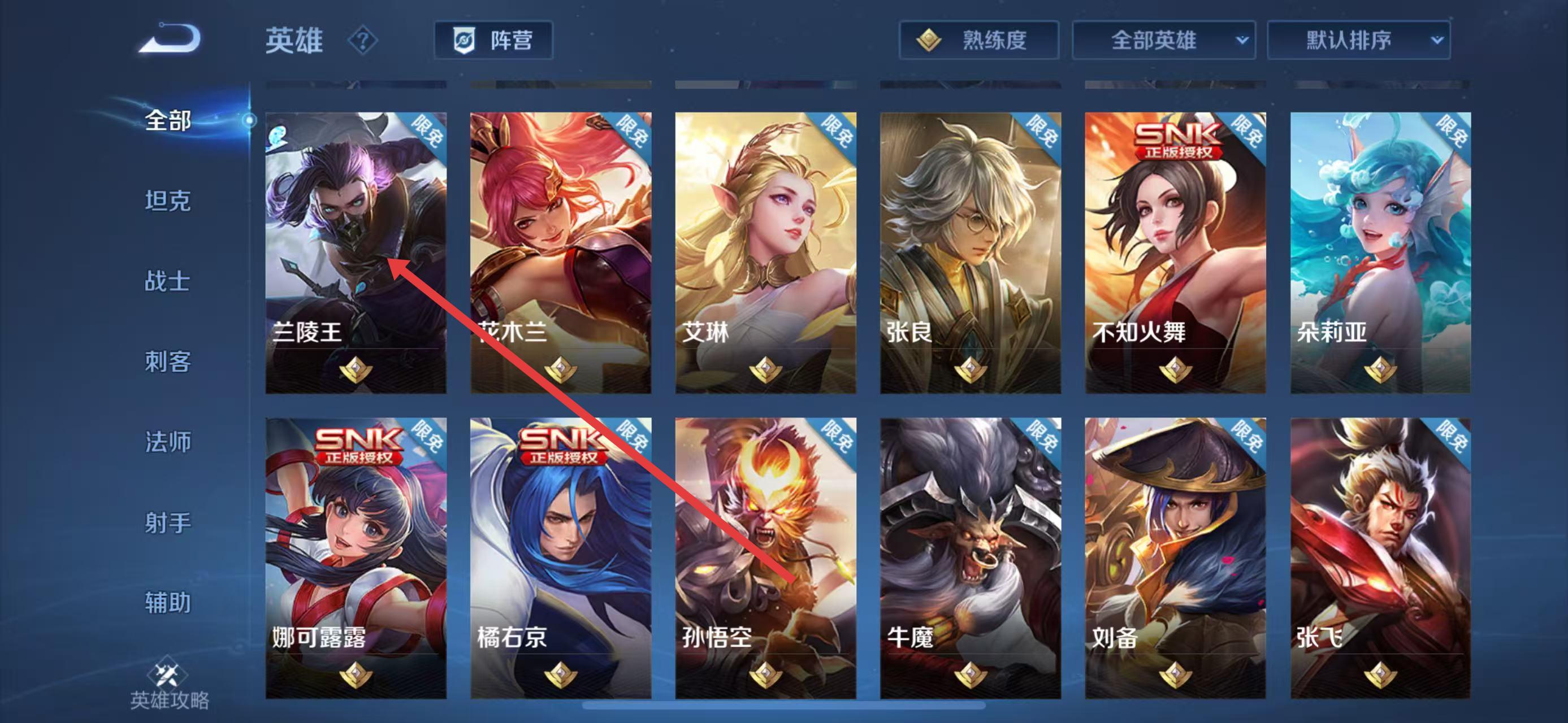 2、在英雄界面,找到并點擊想要購買的英雄如蘭陵王,進入英雄詳情界面。