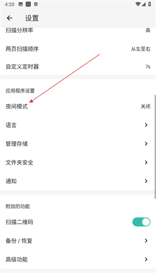 3、在設(shè)置頁面里,找到夜間模式選項(xiàng)并點(diǎn)擊,進(jìn)入夜間模式設(shè)置界面。
