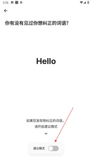 4、將建議模式右側(cè)的開關(guān)按鈕打開即可。