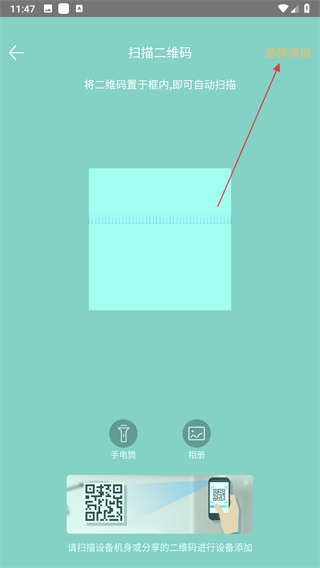 2、在掃描二維碼頁(yè)面點(diǎn)擊右上角的選擇添加選項(xiàng)。