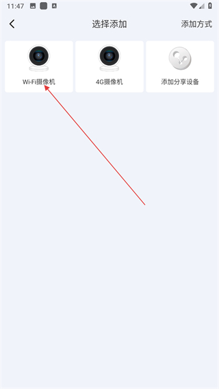 3、進(jìn)入選擇添加頁(yè)面,點(diǎn)擊Wi-Fi攝像機(jī)選項(xiàng)。