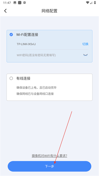 5、選擇Wi-Fi配置連接,輸入WiFi密碼,點(diǎn)擊下一步按鈕。