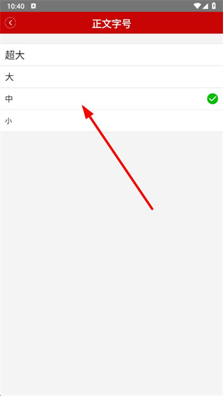 3、在正文字號(hào)設(shè)置界面,可選擇超大、大、中、小等字號(hào),點(diǎn)擊對(duì)應(yīng)選項(xiàng)即可修改字體大小。