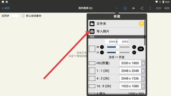 3、在新建菜單中,點擊導入照片選項,可從設(shè)備相冊選取圖片導入,導入到應(yīng)用中進行繪畫創(chuàng)作或編輯處理。