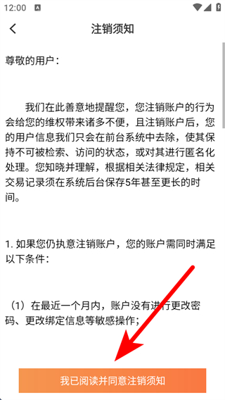 3、在注銷須知頁面,點(diǎn)擊我已閱讀并同意注銷須知,進(jìn)入賬號驗(yàn)證頁面。