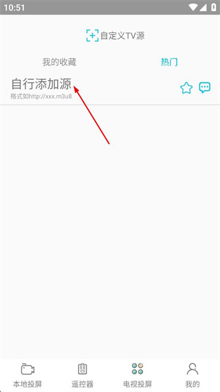 4、登錄后,進(jìn)入自定義TV源界面,點(diǎn)擊“自行添加源”,按格式添加TV源。
