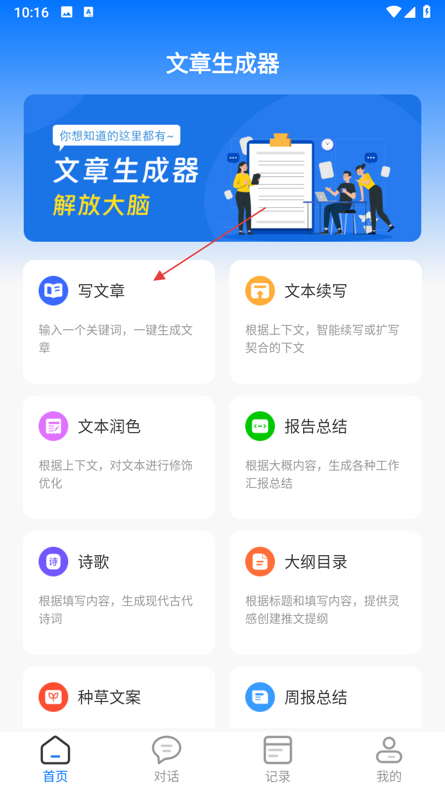 1、打開文章生成器,在主界面點(diǎn)擊寫文章選項(xiàng),進(jìn)入寫文章設(shè)置頁面。