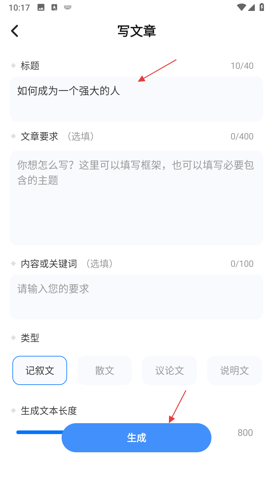 2、在寫文章頁面的標(biāo)題輸入框中輸入文章標(biāo)題,若有需要,可在文章要求,內(nèi)容或關(guān)鍵詞輸入框中填寫框架、必要主題或關(guān)鍵詞,再選擇文章類型,并調(diào)整生成文本長度。