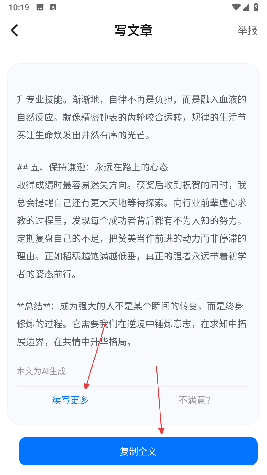 3、點(diǎn)擊生成按鈕,等待文章生成完成后,可點(diǎn)擊續(xù)寫更多補(bǔ)充內(nèi)容,也可點(diǎn)擊復(fù)制全文將生成的文章復(fù)制到剪貼板。