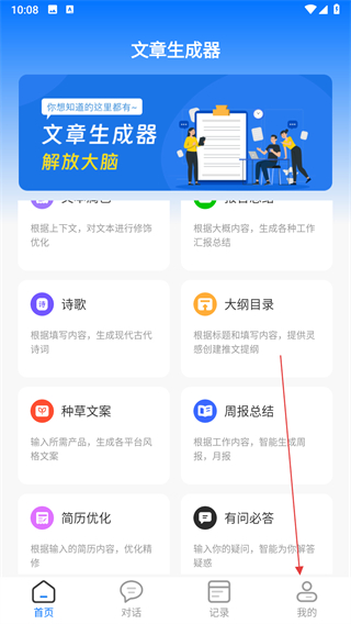 1、打開文章生成器APP,點(diǎn)擊我的選項(xiàng)。