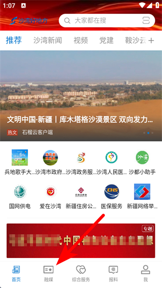 1、打開(kāi)沙灣好地方APP首頁(yè),點(diǎn)擊底部融媒,進(jìn)入融媒板塊頁(yè)面。