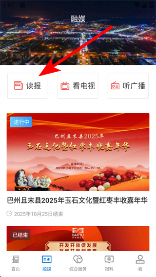 2、在融媒板塊的頁(yè)面,需要點(diǎn)擊讀報(bào)的選項(xiàng),進(jìn)入讀報(bào)界面。