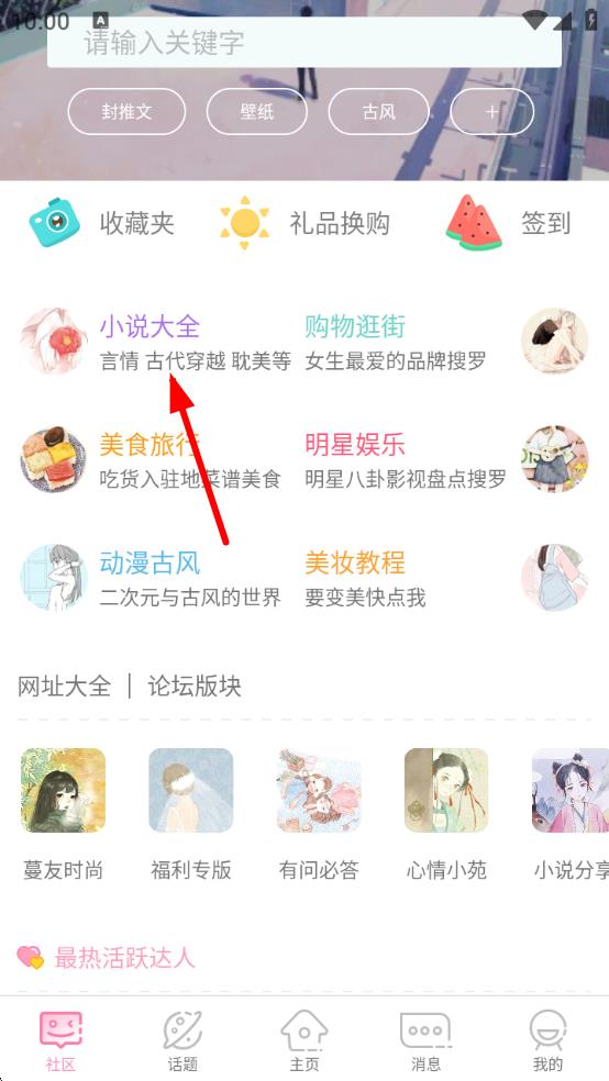 2、在社區(qū)界面中,找到小說大全塊,點擊進(jìn)入可瀏覽各類小說資源。