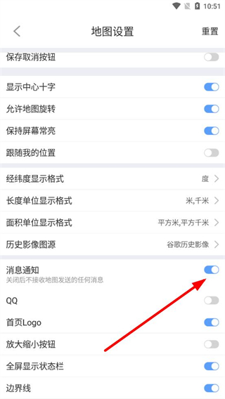 3、在地圖設(shè)置頁面,找到消息通知選項,將其對應(yīng)的開關(guān)關(guān)閉,即可關(guān)閉奧維測繪地圖的消息通知。