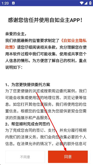 1、打開自如業(yè)主app,在彈出的頁面,點擊同意按鈕。