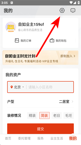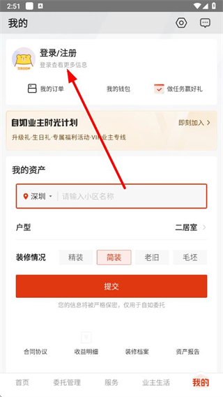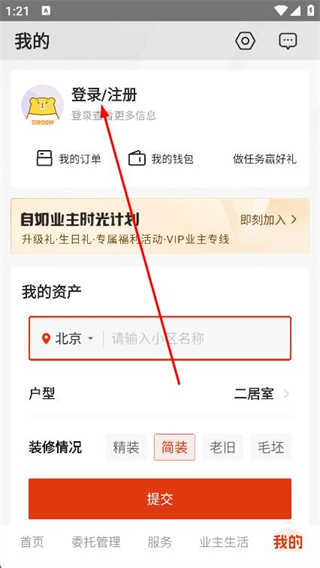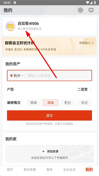 1、打開自如業(yè)主端APP后,在我的界面點擊頭像名稱區(qū)域。