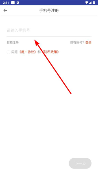 4、在手機號注冊頁面,輸入手機號,勾選同意用戶協(xié)議,點擊下一步按提示完成注冊。