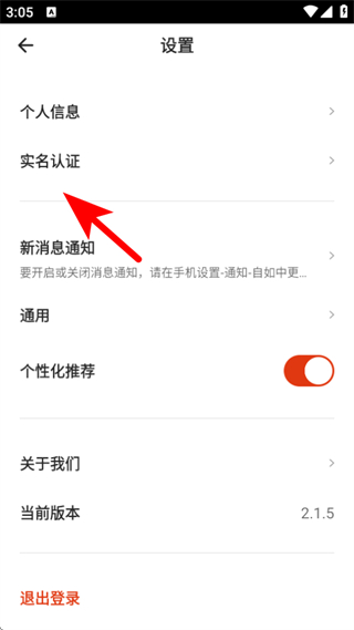 3、在設(shè)置界面中,點擊實名認證選項,進入實名認證頁面。