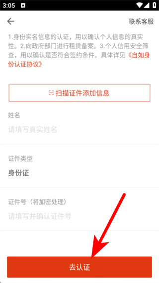 4、在頁面可掃描證件添加信息,依次填寫姓名等,完成后點擊去認證。
