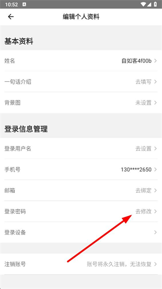 3、在編輯個人資料頁面,找到登錄密碼選項旁的去修改按鈕。
