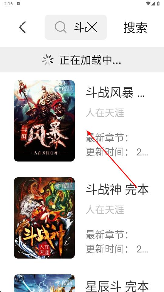 2、在搜索結(jié)果加載完成后,瀏覽列表,選擇目標(biāo)小說(shuō)如斗戰(zhàn)風(fēng)暴,點(diǎn)擊進(jìn)入小說(shuō)詳情頁(yè)面。