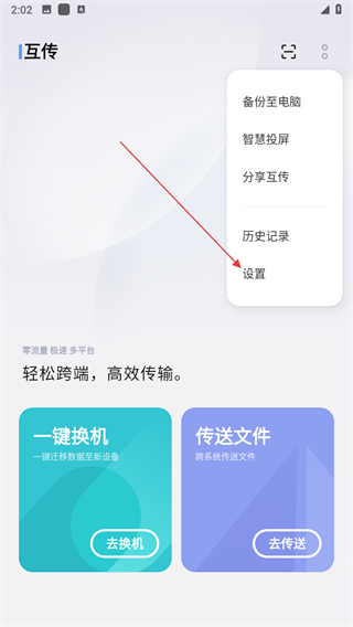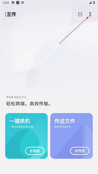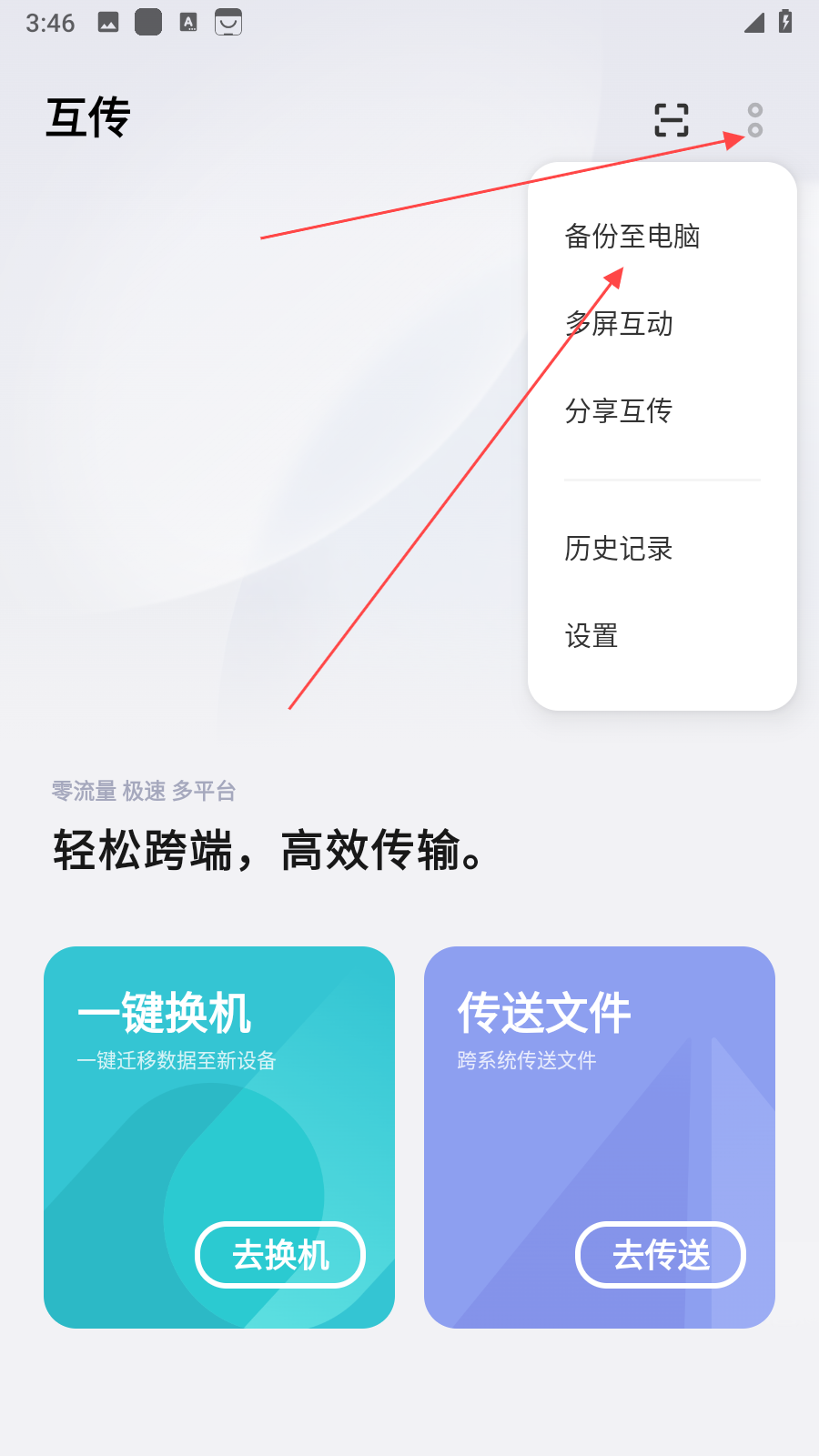 1、打開手機上的互傳應用,點擊主界面右上角的三點圖標,在彈出的菜單中選擇備份至電腦選項。