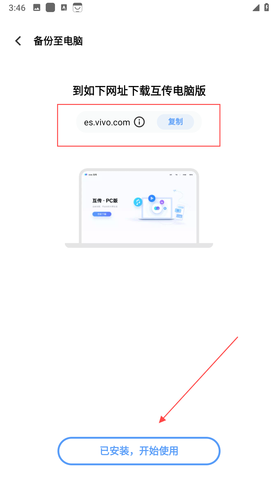 2、若電腦未安裝互傳電腦版,點擊頁面中顯示網(wǎng)址es.vivo.com,進行復制后,在電腦瀏覽器打開該網(wǎng)址并下載安裝互傳電腦版,若已安裝,直接點擊已安裝,開始使用。